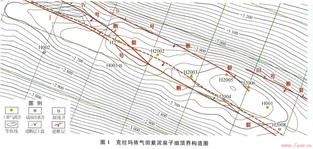 H氣田紫泥泉子組氣藏主要發(fā)育4條近東西向南傾的逆斷裂(圖1),其中斷穿紫泥泉子組地層的斷裂有3條:工號斷裂、Ⅱ號斷裂及Ⅲ號斷裂。
