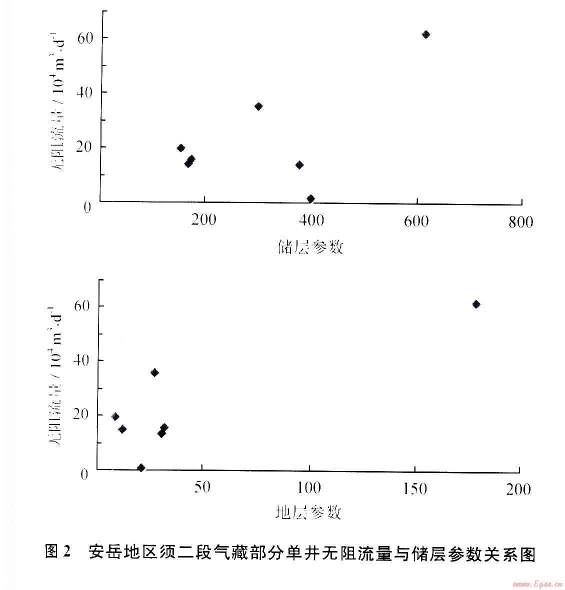 對(duì)儲(chǔ)層基礎(chǔ)參數(shù)較全的7口井,統(tǒng)計(jì)了安岳須二段氣藏(上亞段)計(jì)算的無(wú)阻流量與儲(chǔ)層參數(shù)相關(guān)性分析(圖2),儲(chǔ)層參數(shù)、地層系數(shù),無(wú)阻流量與它們間具有一定的正向相關(guān)件性不大.
