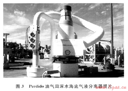 Song和Kouba提出了海底氣液分離[5]的方式,分離后氣液分輸至平臺(tái),段塞流因此而被消除。2009年Henning報(bào)道Tordis、BC~10和Pazflor等油氣田都應(yīng)用了此技術(shù)[6]。2010年3月Shell在墨西哥灣(GOM)水深達(dá)2440m的Perdido油氣田投產(chǎn),意味著其應(yīng)用的深水海底氣液分離技術(shù)取得了成功,其海底氣液分離器如圖3所示。