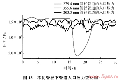 圖13為不同管徑下管道入口壓力的變化圖。由圖13可知,采用203.2mm管徑的管道時(shí),需要的管道入口壓力高于采用279.4mm管徑的管道時(shí)的管道入口壓力,而采用355.6mm管徑的管道時(shí),需要的管道入口壓力不僅較高,還會(huì)出現(xiàn)很大的波動(dòng)。相比279.4mm管徑的管道而言,這2種管徑的管道都不利于提高油氣產(chǎn)量。