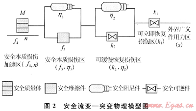安全流變 突變的物理模型由4組元件組成(如圖2)。整個(gè)系統(tǒng)框架模型分為5個(gè)層次:外界廣義作用力區(qū)、可立即恢復(fù)損傷區(qū)、可緩慢恢復(fù)損傷區(qū)、安全本質(zhì)損傷區(qū)、安全本質(zhì)損傷加速區(qū),每個(gè)層次的反應(yīng)機(jī)理和作用各不相同。事物就是在這種模型下對外界廣義作用力作出相應(yīng)的反應(yīng),最終決定事物是處于安全狀態(tài)還是危險(xiǎn)狀態(tài)的。
