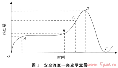 假設(shè)將事物的危險(xiǎn)狀態(tài)用損傷程度來表示,那么事物的“安全流變-突變”的全過程可以表述為(如圖1):當(dāng)某一事物誕生后的初期(OA階段),其損傷量在外界力的作用下呈減速遞增,新的狀態(tài)在此期間逐漸形成和完善。當(dāng)新的狀態(tài)發(fā)展到成熟階段時(shí)(AB階段),完善的新狀態(tài)使損傷量勻速緩慢增加。當(dāng)經(jīng)過一段穩(wěn)定增加后,原狀態(tài)將再次向無序方向發(fā)展,進(jìn)而使損傷量值開始加速增大(BC段)。任何事物都有其固有的損傷量承受能力或臨界點(diǎn)(D點(diǎn)),超出此臨界點(diǎn)(D點(diǎn))后,事物將發(fā)生安全突變。當(dāng)事物的原狀態(tài)遭到破壞后,事物又重新回到一個(gè)新的安全狀態(tài),原事物的狀態(tài)消失,從而又形成了另一個(gè)同類新事物誕生的新起點(diǎn)(E點(diǎn))。物質(zhì)世界就是在這種安全與危險(xiǎn)的無限循環(huán)中得以存在和發(fā)展的[4]。