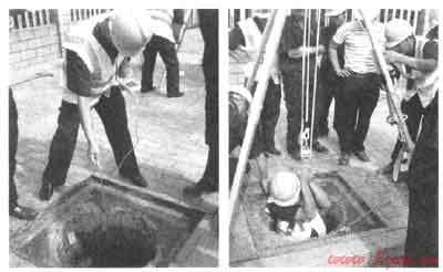 4) 密閉場地外的現(xiàn)場要配備合適的起重設(shè)備,例如設(shè)有吊重裝置的三腳架,配合救生繩及安全帶作救援之用;