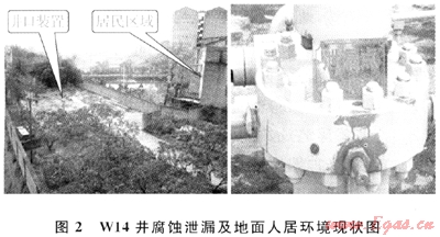 ① 井口裝置存在缺陷;②油層套管固井質(zhì)量較差;③油層套管絲扣滲漏;④完井管柱存在缺陷(未下入永久式封隔器,油管絲扣和工具存在泄漏);⑤防腐工藝措施不到位,油、套管和井口裝置存在腐蝕和滲漏;⑥高含硫氣井存在缺陷,又處于人口密集和環(huán)境敏感區(qū)域,存在高含硫氣泄漏導致環(huán)境污染。如位于人口聚集區(qū)的W14井,H2S含量65.8g/m3,存在井口、井下油套管腐蝕泄漏及硫化氫中毒的嚴重安全隱患(圖2)。