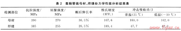 在四川某集輸管線上截取試樣分別按照國家標準進行理化性能試驗,管線母材和焊縫的化學成分、力學性能綜合測試結(jié)果見表1、2。