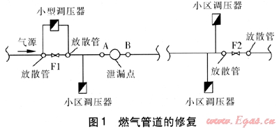 修復(fù)作業(yè)開始時,派人在各調(diào)壓站監(jiān)測各小區(qū)中、低壓管網(wǎng)壓力,當(dāng)確定各小區(qū)均無大量用氣后,關(guān)閉泄漏點(diǎn)兩側(cè)的閥門F1、F2。在閥門F1、F2關(guān)閉后、放散燃?xì)馇?,將各小區(qū)低壓壓力提高到2940Pa后,關(guān)閉小區(qū)調(diào)壓器,以滿足少數(shù)用戶的用氣需求(如果作業(yè)時小區(qū)的低壓壓力低于784Pa,可打開小區(qū)調(diào)壓器旁通供氣)。在F2閥門左側(cè)的放散管進(jìn)行放散,將中壓壓力降至784~980Pa。壓力降到搶修工作壓力后,開始作業(yè)。秦皇島市燃?xì)夤艿来蟛糠质堑冉孛骅T鐵直管道,接口采用錐套式柔性接口,因此不論泄漏點(diǎn)是位于管道接口還是管道本身,要想修復(fù)均需切掉一段泄漏點(diǎn)所在的管道(長約1m),更換新管道,重新使用連接套連接。切斷管道前,拆掉工作孔A、B上的閥門,塞入阻氣袋(防止切斷管道時放空燃?xì)?,混入空氣產(chǎn)生爆炸)。然后切斷管道并更換新管道,進(jìn)行接口連接等工作。接口連接完畢,撤出工作孔A處的阻氣袋,通過F1處的小型調(diào)壓器輸送燃?xì)?,用燃?xì)庵脫Q新管道內(nèi)的空氣。置換完成后,撤掉工作孔B處的阻氣袋,稍開閥門F1,使管內(nèi)壓力緩慢上升,達(dá)到運(yùn)行壓力后,對接口進(jìn)行查漏。查漏合格則完全打開閥門F1、F2。在完全開啟閥門F1、F2前,各調(diào)壓站人員關(guān)閉小區(qū)調(diào)壓器旁通閥,準(zhǔn)備恢復(fù)正常供氣。另外,如果小區(qū)壓力低于588Pa,且搶修發(fā)生在夜間,為防止出現(xiàn)用戶室內(nèi)事故,應(yīng)先關(guān)閉調(diào)壓器,在清晨用氣前進(jìn)行恢復(fù)供氣的宣傳,才能開啟調(diào)壓器進(jìn)行供氣;如果小區(qū)壓力大于588Pa,可把壓力直接調(diào)整到正常壓力恢復(fù)供氣。以上工作完成后,回填作業(yè)坑,清理現(xiàn)場,作業(yè)結(jié)束。