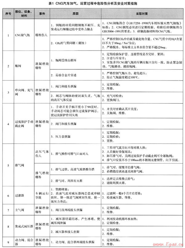 2.6 CNG汽車加氣、運營過程中危險性分析見表1。