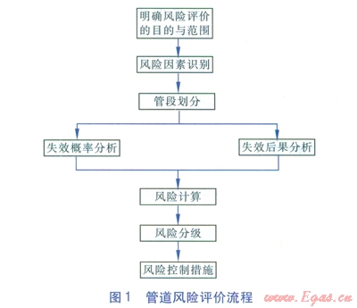 風(fēng)險評價是指識別出對管道安全運行產(chǎn)生不利影響的風(fēng)險因素,評價事故發(fā)生的可能性和后果,綜合得到管道風(fēng)險大小,并提出相應(yīng)風(fēng)險控制措施的分析過程[6]。風(fēng)險評價是完整性管理的關(guān)鍵環(huán)節(jié),應(yīng)根據(jù)評價范圍、復(fù)雜程度采用不同的方法和技術(shù)。管道風(fēng)險評價流程見圖l,其中的幾個主要環(huán)節(jié)一般為風(fēng)險因素識別、失效概率分析、失效后果分析和風(fēng)險分級。