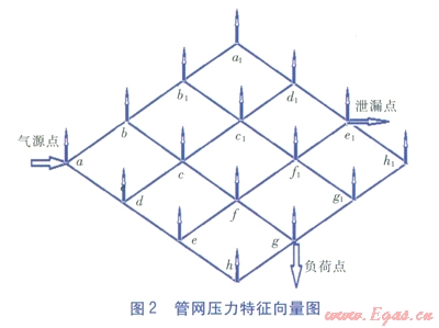 管網(wǎng)具有不同的運行工況時,如單氣源點或者多氣源點管網(wǎng)以及氣源點位置不同,單負荷點或者多負荷點以及負荷點位置不同,管網(wǎng)的壓力特征向量圖都是不同的,管網(wǎng)不同的環(huán)、不同的位置出現(xiàn)泄漏時對壓力特征向量的影響更是不同。在大量模擬數(shù)據(jù)以及實驗數(shù)據(jù)的基礎上,對各種不同工況下的泄漏進行分析,可以依據(jù)壓力特征向量圖對其是否發(fā)生泄漏以及泄漏點位置進行判定[2]。