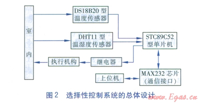 選擇性控制系統(tǒng)的設(shè)計(jì)思路是在優(yōu)先保證室內(nèi)溫度達(dá)到預(yù)設(shè)值的前提下,調(diào)節(jié)室內(nèi)空氣相對濕度以最大限度地降低空調(diào)系統(tǒng)能耗。溫濕度傳感器實(shí)時(shí)測量室內(nèi)空氣的溫濕度,并通過串行接口將溫濕度信號(hào)傳至單片機(jī),單片機(jī)將接收到的溫濕度信號(hào)與內(nèi)部預(yù)置及計(jì)算的溫濕度范圍進(jìn)行比較判定,并將實(shí)時(shí)溫濕度信號(hào)通過通信接口上傳至上位機(jī)顯示。在單片機(jī)比較判定結(jié)束后,將控制信號(hào)傳遞給繼電器,繼電器通過控制執(zhí)行機(jī)構(gòu)在優(yōu)先滿足室內(nèi)溫度需要的前提下,進(jìn)行室內(nèi)空氣相對濕度調(diào)節(jié)[4]。選擇性控制系統(tǒng)的總體設(shè)計(jì)見圖2。