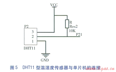 DHTll型溫濕度傳感器(由于其測溫范圍較窄,精度欠佳,因此選擇性控制系統(tǒng)只利用其測相對濕度功能)是一款含有已校準(zhǔn)數(shù)字信號(hào)輸出的單總線制溫濕度傳感器。DHTl l型溫濕度傳感器包括1個(gè)電阻式感濕元件、1個(gè)NTC測溫元件[5]。測量范圍:相對濕度20%~90%,溫度0~50℃。DHTll型溫濕度傳感器與單片機(jī)的連接見圖5。引腳1為地線接口,引腳2為數(shù)據(jù)通信線接口,引腳3為電源線接口。