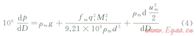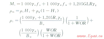式中P為井筒中任意點的壓力,MPa;D為井深,m;rm為氣液混合物的密度,kg/m3;um為氣液混合物的流速,m/s;g為重力加速度,m/s2;fm為兩相摩阻系數(shù);d為油管內(nèi)徑,m;qt為地面產(chǎn)液量,m3/d;Mt為地面標況下,每生產(chǎn)1m3液體伴生油、氣、水的總質(zhì)量,kg/m3;H1為持液率;r1為液體密度,kg/m3;go、gg、gw分別為油、氣、水的相對密度;Rs為天然氣的溶解氣油比;Bo、Bw分別為油、水的體積系數(shù);WOR為生產(chǎn)水油比;rw、rg分別為水、氣的密度,kf/m3;¦w、¦o分別為所產(chǎn)液體中的含水率、含油率;GLR為氣液比。