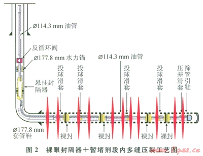 段內(nèi)多縫體積壓裂可以有效動(dòng)用不同滲透率級(jí)別層段,在儲(chǔ)層中形成一定程度的復(fù)雜縫網(wǎng),進(jìn)一步增加改造體積,從而提高單井產(chǎn)量和采收率[9-10]。具體做法是在水平井裸眼完井條件下一次性下入水平井裸眼分段壓裂管柱,段內(nèi)加暫堵劑實(shí)現(xiàn)段內(nèi)多縫,逐級(jí)投球打開(kāi)滑套并封堵下層油管,實(shí)現(xiàn)水平井裸眼段多級(jí)多段壓裂改造規(guī)模(圖2)。