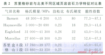 與北美頁(yè)巖氣相比,蘇里格氣田主力層20塊巖心做巖石力學(xué)實(shí)驗(yàn),單軸抗壓強(qiáng)度都在20MPa以上,抗拉強(qiáng)度基本在3~9MPa之間,盒8段楊氏模量17760~3917 MPa;泊松比0.21,山l段楊氏模量23860~33350MPa;泊松比0.25,泊松比較低。