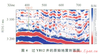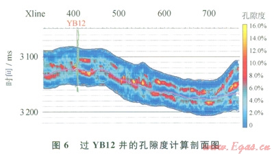 目前,各種地震疊前數(shù)據(jù)反演的軟件[16]。和疊前反演的方法[17-22]都比較成熟,通過較好的疊前三維地震資料可以較準(zhǔn)確地反演出縱波速度、橫波速度和體積密度等彈性參數(shù)。圖4為過YBl2井的原始疊后地震剖面。儲層位于圖中標(biāo)注的層位為下三疊統(tǒng)飛仙關(guān)組一段上二疊統(tǒng)長興組之間[23-25]。從剖面上可以看出地層的橫向變化大,分辨率低,信噪比較低等特征。圖5-a、b和c分別為應(yīng)用疊前同時反演方法獲得的縱波速度、橫波速度和體積密度反演剖面。從圖中可以看出,井旁道反演的數(shù)據(jù)與測井曲線的相關(guān)性較好。從反演數(shù)據(jù)剖面中可以發(fā)現(xiàn),疊前彈性參數(shù)反演獲得橫波速度數(shù)據(jù)和密度數(shù)據(jù)剖面的分辨率高于縱波速度數(shù)據(jù)剖面上的分辨率,為縱向高分辨率的孔隙度計(jì)算提供了條件。圖6為應(yīng)用本方法計(jì)算的過YB12井的孔隙度剖面。從圖6中還可以看出,計(jì)算孔隙度與實(shí)測孔隙度之間的相關(guān)性非常高,計(jì)算的孔隙度數(shù)據(jù)的分布范圍也與測井?dāng)?shù)據(jù)相當(dāng)吻合,并且從孔隙度剖面上能夠?qū)⒃搩佣畏譃樯舷聝商卓紫抖劝l(fā)育的儲層,孔隙度計(jì)算剖面上展布的橫向規(guī)律與地質(zhì)、鉆井認(rèn)識規(guī)律保持一致。因此,從孔隙度計(jì)算的結(jié)果可以看出,筆者提議的孔隙度計(jì)算方法在碳酸鹽巖儲層孔隙度計(jì)算中效果比較明顯,能夠較好地提高孔隙度計(jì)算的精確度。