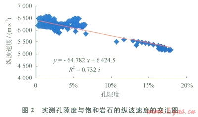 為了驗(yàn)證提議方法的正確性,將提議方法用于YB地區(qū)。該地區(qū)儲層屬于碳酸鹽巖礁灘相儲層,儲層埋藏深,總體上孔隙度較小,圍巖與儲層的縱波速度差異小,鉆井和地質(zhì)資料表明儲層分為上下兩套儲層。工區(qū)中1口鉆井的測井曲線如圖l所示。測井曲線從左到右,依次為自然伽馬、縱波速度、橫波速度、體積密度和孔隙度曲線。圖2為實(shí)測孔隙度與飽和巖石縱波速度交匯圖。交匯圖的線性回歸分析表明,孔隙度與飽和巖石的縱波速度的相關(guān)值平方約為0.73。圖3為孔隙度與飽和巖石的有效壓縮系數(shù)交匯圖。實(shí)測孔隙度與應(yīng)用巖石的有效壓縮系數(shù)計(jì)算的孔隙度相關(guān)值平方達(dá)到0.85,表明孔隙度與巖石的有效壓縮系數(shù)之間有著良好的線性關(guān)系。與僅僅利用縱波速度計(jì)算孔隙度結(jié)果相比較,利用飽和巖石的有效壓縮系數(shù)計(jì)算的孔隙度精確度提高約12%。
