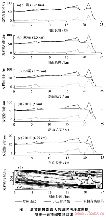 為得到能夠準(zhǔn)確反映實(shí)際礁體分布的頂帽變換結(jié)果,需要選擇合適的結(jié)構(gòu)元素。根據(jù)頂帽變換原理,結(jié)構(gòu)元素大小應(yīng)與礁體大小相匹配。由地震解釋結(jié)果知,研究區(qū)內(nèi)的礁體在二維地震剖面上的視寬度一般為100~200道或2.5~5km(道間距為25m)。為了得到合理的適合于工區(qū)礁體大小的結(jié)構(gòu)元素,分別選取了邊長(zhǎng)為50、100、150、200、250道的正方形結(jié)構(gòu)元素進(jìn)行頂帽變換實(shí)驗(yàn),其結(jié)果如圖1、2所示。