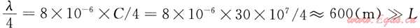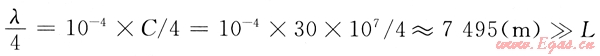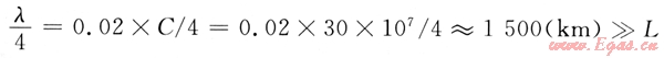 電磁波傳播速度C≈30×107m/s,取L=150m。工頻交流電壓的1/4波長(zhǎng)為