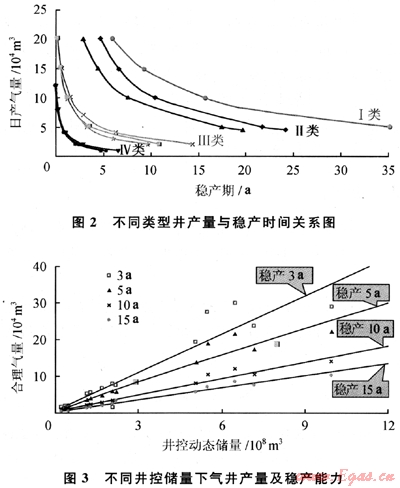 綜合分析徐深氣田試采井的地層系數(shù)、穩(wěn)定產(chǎn)能、單位壓降采氣量等地質(zhì)和動(dòng)態(tài)特征,對(duì)系統(tǒng)試采的井進(jìn)行了分類評(píng)價(jià)。綜合單井試采結(jié)果,結(jié)合不穩(wěn)定試井以及數(shù)值試井方法,建立了開發(fā)早期單井合理產(chǎn)量與穩(wěn)產(chǎn)能力關(guān)系圖版,確定氣井初期產(chǎn)能、落實(shí)合理產(chǎn)量(圖2、3)。