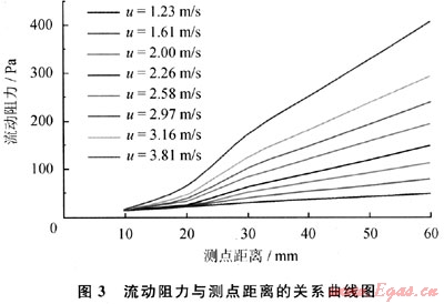由式(1)可以看出,阻力應(yīng)該與距離成正比。分析造成上述實(shí)驗(yàn)現(xiàn)象的原因是:實(shí)驗(yàn)中放置泡沫陶瓷的鋼管與高壓氮?dú)馄窟B接需要變徑,氣流在異徑處附近的流速分布不是充分發(fā)展紊流,流速分布不對稱,有畸變,還可能有漩渦、回流,在測點(diǎn)處的流速偏小,曲線向速度較低的曲線靠近,形成了圖3中與測點(diǎn)A的距離小于30mm時(shí)的流動(dòng)阻力形態(tài)。因此,在以下分析中,僅對測點(diǎn)距離大于30mm的數(shù)據(jù)進(jìn)行分析,即對測點(diǎn)距離小于30mmm的泡沫陶瓷流動(dòng)進(jìn)行調(diào)整,以此來消除異徑對測量結(jié)果的影響。