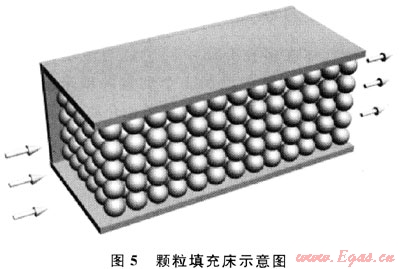 氣流在多孔介質(zhì)中的流動(dòng)阻力主要是由流體質(zhì)點(diǎn)間存在相互牽制作用、流體與多孔介質(zhì)的表面摩擦造成的。圖5為顆粒填充床示意圖。對于氣流在顆粒填充床與泡沫陶瓷中的流動(dòng),若兩者的比表面積及空隙率相等,可認(rèn)為兩者的流動(dòng)阻力是近似相等的。