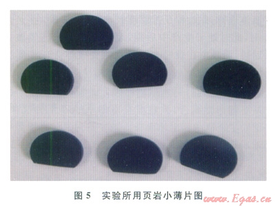 頁(yè)巖樣品實(shí)驗(yàn)裝置如圖4所示,實(shí)驗(yàn)方法如下:為了統(tǒng)一實(shí)驗(yàn)標(biāo)準(zhǔn),將頁(yè)巖磨成如圖5所示的大小均勻的薄片,薄片的厚度為3.45mm;然后將小薄片烘干(100℃)48h后冷卻,將頁(yè)巖薄片懸掛在天平上,沉入測(cè)試的液體中,記錄頁(yè)巖吸水后質(zhì)量隨時(shí)間的變化。