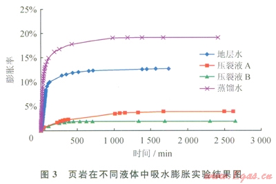 實(shí)驗(yàn)中使用的液體分別為蒸餾水、地層水、壓裂液A和壓裂液B,實(shí)驗(yàn)結(jié)果如圖3所示。可以看到頁(yè)巖在蒸餾水中的膨脹率最高,接近20%;而壓裂液中頁(yè)巖的膨脹率比地層水和蒸餾水明顯低很多,說(shuō)明了壓裂液在抑制頁(yè)巖吸水膨脹方面效果不錯(cuò)。