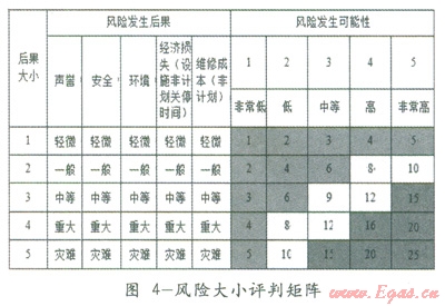 管道的風(fēng)險(xiǎn)評(píng)價(jià)可使用定性、半定量或定量的方法進(jìn)行。設(shè)計(jì)數(shù)據(jù)、管道運(yùn)行數(shù)據(jù)及檢測(cè)數(shù)據(jù)等應(yīng)作為評(píng)估的基礎(chǔ)數(shù)據(jù)。風(fēng)險(xiǎn)評(píng)價(jià)是進(jìn)行檢測(cè)、監(jiān)控和完整性管理的基礎(chǔ)。因此,對(duì)管道進(jìn)行風(fēng)險(xiǎn)狀況評(píng)價(jià)后必須進(jìn)行風(fēng)險(xiǎn)等級(jí)劃分。即完成運(yùn)行期管道風(fēng)險(xiǎn)狀況評(píng)估后,給出一個(gè)風(fēng)險(xiǎn)劃分的標(biāo)準(zhǔn),把不同風(fēng)險(xiǎn)狀況的管道進(jìn)行歸類。