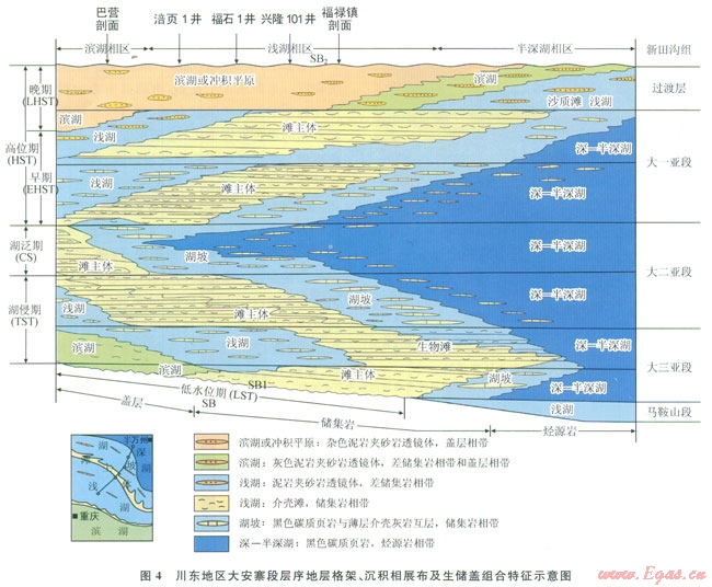 1)川東地區(qū)大安寨段為淡水湖泊沉積體系,發(fā)育濱湖、淺湖、湖坡和深—半深湖4種亞相,對應(yīng)完整的湖侵湖退旋回過程,可劃分為低位、湖侵、早期高位和晚期高位4個沉積體系域。