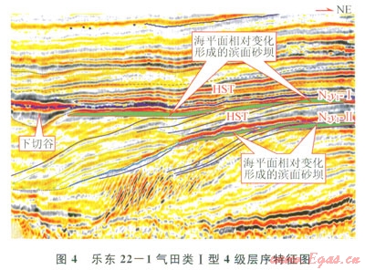 樂東22-1氣田主物源來自北東方向的海南島,為發(fā)育在陸架濱 淺海背景下,受沉積坡折控制的灘壩復(fù)合體沉積。儲(chǔ)層的形成,與海平面短期快速升降、強(qiáng)制性海退背景下形成的4級(jí)層序有關(guān)。4級(jí)層序界面以類工型界面為主,層序結(jié)構(gòu)主要表現(xiàn)為前積型特征,頂積層較薄(圖4)。S型疊加4級(jí)層序的頂積層可形成良好的儲(chǔ)集層,在沉積坡折以下多以淺海相泥巖、泥質(zhì)粉砂巖為主,儲(chǔ)層不發(fā)育(圖5)。準(zhǔn)確把握層序形成機(jī)制和疊加樣式[7-8],可以有效地預(yù)測(cè)和把握有利儲(chǔ)層的分布,減少儲(chǔ)層預(yù)測(cè)上的失誤,降低風(fēng)險(xiǎn)。通過對(duì)儲(chǔ)層的精細(xì)描述,刻畫有利砂體的展布,指導(dǎo)生產(chǎn)井的部署和井位優(yōu)化。