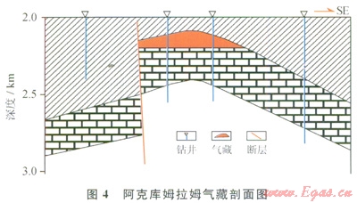 別什肯特坳陷與基薩爾褶皺隆起區(qū)新生代擠壓構(gòu)造運(yùn)動強(qiáng)烈,基底古構(gòu)造破壞大,構(gòu)造圈閉形成受新生代擠壓構(gòu)造運(yùn)動控制,以逆掩斷裂背斜、斷背斜和擠壓背斜等構(gòu)造圈閉為主,圈閉幅度大。如位于基薩爾褶皺隆起區(qū)阿克庫姆拉姆氣田,為一北東走向的逆沖斷裂擠壓背斜構(gòu)造氣藏,氣藏西翼被逆沖斷裂切割,碳酸鹽巖與鹽膏巖對接,形成側(cè)向遮擋,構(gòu)成了逆沖斷裂背斜構(gòu)造氣藏(圖4)。