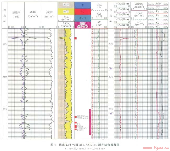 為了提高薄氣層厚度的解釋精度,引進(jìn)陣列感應(yīng)測(cè)井[12](Array Induction Tool,簡(jiǎn)稱(chēng)AIT)、方位電阻率測(cè)井[13](Azimuthal Resistivity Imager,簡(jiǎn)稱(chēng)ARI)、綜合孔隙度測(cè)井(Integration Porosity Log,簡(jiǎn)稱(chēng)IPL)提高了薄層厚度的解釋精度。如圖4中在519.7~521.4m,氣層段由于侵入影響AO90電阻率值明顯高于常規(guī)感應(yīng)電阻率值6W·m左右;而在580.0~591.0m氣層段為砂泥巖交互層段AO90電阻率曲線明顯顯示了砂泥巖薄互層的特性,薄砂層電阻率明顯高于常規(guī)感應(yīng)電阻率值,而常規(guī)感應(yīng)電阻率曲線只反映了薄互層的平均電阻率值,同時(shí),AST、IPL等曲線也顯示了與之對(duì)應(yīng)的砂泥巖薄互層的特性。