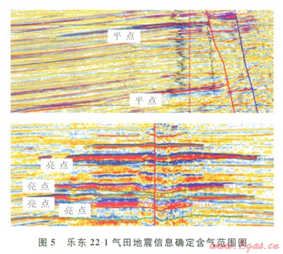 這一評(píng)價(jià)思路慕于以下幾點(diǎn)認(rèn)識(shí):①“模糊區(qū)”的形成可能是由淺層氣屏蔽和熱流體造成;②“模糊區(qū)”在時(shí)間剖面上的下凹,很可能是速度陷阱造成的假象,可能是構(gòu)造的高部位;③從沉積相分析,該區(qū)儲(chǔ)層可能是連片分布的,也就是說(shuō)“模糊區(qū)”內(nèi)可能存在儲(chǔ)層;④該區(qū)域已發(fā)現(xiàn)的東方1-1氣田和樂(lè)東l5-1氣田的含氣范圍在地震資料上都有平點(diǎn)或亮點(diǎn)等異常特征,該氣田可能也存在這一特征。