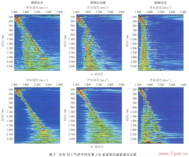 基于上述認(rèn)識(shí),加強(qiáng)了對(duì)全區(qū)的地震速度譜的解釋分析。分析發(fā)現(xiàn)“模糊區(qū)”外速度譜能量團(tuán)集中,質(zhì)量較好,解釋可靠;進(jìn)入“模糊區(qū)”后,速度譜質(zhì)量明顯降低,看不到一次波的能量團(tuán),特別是中心部位只有多次波的能量團(tuán)出現(xiàn),無(wú)法進(jìn)行速度解釋(圖3)。分析認(rèn)為該區(qū)淺層氣十分發(fā)育,淺層氣與其圍巖的波阻抗差別很大,從而形成很強(qiáng)的反射。淺氣層與淺氣層之間、淺氣層與海底之間就產(chǎn)牛了很強(qiáng)的層間多次波,致使在地震速度譜上一次波的能量被掩蓋,譜上顯示出的全是多次波的能量團(tuán)。因此壓制多次波便成為精細(xì)速度分析的首要任務(wù)。經(jīng)過(guò)多次試驗(yàn),f-K濾波。叫對(duì)壓制本區(qū)的多次波效果較好(圖3)。經(jīng)濾波處理后,“模糊區(qū)”外正常地層的速度譜能量團(tuán)更清楚;剛進(jìn)入“模糊區(qū)”的速度譜也出現(xiàn)了較集中的一次波的能量團(tuán),能夠準(zhǔn)確地進(jìn)行解釋?zhuān)?ldquo;模糊區(qū)”中心的速度譜雖然仍有較強(qiáng)的多次波能量團(tuán)出現(xiàn),但一次波的能量團(tuán)已清楚地出現(xiàn)在速度譜上,完全可以進(jìn)行可靠的速度解釋。