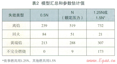 本文限于篇幅,對(duì)每一互換性指數(shù),只能介紹少量的實(shí)驗(yàn)數(shù)據(jù)。即使如此,也可看出實(shí)驗(yàn)數(shù)據(jù)的離散性很大。究其原因,實(shí)與原始的調(diào)定情況有一定的關(guān)系。同一燃具,調(diào)定人員的調(diào)定尺度本身就具有一定的隨機(jī)性。稍有實(shí)驗(yàn)室工作經(jīng)驗(yàn)的人對(duì)此都有體會(huì),更何況研究所針對(duì)的是要滿(mǎn)足全部各類(lèi)燃具的要求,而不是某一種燃具。當(dāng)前天然氣民用炊事燃具在用戶(hù)的使用中,由于廚房條件的千差萬(wàn)別,最易出現(xiàn)的是黃焰端問(wèn)題,遺憾的是多年來(lái)并未引起重視,如表2所示,失效也與燃具的試驗(yàn)壓力有關(guān)。用戶(hù)處在管網(wǎng)不同的聯(lián)接位置,對(duì)試驗(yàn)結(jié)果也有影響。