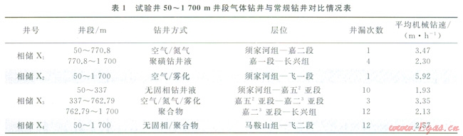 由表l可知,氣體鉆井在上部地層防漏效果非常好。例如,相儲X1井在須家河組—嘉二段采用氣體鉆井進尺720.8m,僅漏失l次,平均機械鉆速3.47m/h,而相儲X3井在50~387m采用無固相鉆井液鉆井漏失l0次,平均機械鉆速僅為l.93m/h。通過50~1700m井段氣體鉆井與常規(guī)鉆井對比分析可知,氣體鉆井既克服了上部地層漏欠層的惡性井漏問題,保證了安全鉆進,而且大幅度提高了機械鉆速、縮短了鉆井周期。
