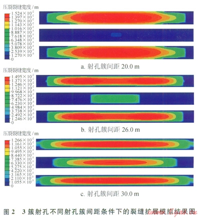 筆者模擬了2簇、3簇和4簇射孔在不同的射孔簇間距條件下的裂縫擴展,圖2所示為3簇射孔、不同的射孔簇間距條件下的擴展結(jié)果,圖2-a為射孔簇間距為20.0m時的裂縫擴展結(jié)果,中間的射孔簇只能開啟小段距離后就發(fā)生止裂,不能形成有效裂縫;圖2-b所示的為射孔簇間距為26.0m時的裂縫寬度圖,中間的射孔簇產(chǎn)生的壓裂裂縫能擴展一段距離,但是裂縫的艮度有限,不到兩端射孔壓裂裂縫的一半;圖2-c所示的是射孔簇間距為30.0m時的裂縫擴展結(jié)果,中間的裂縫長度只比兩端的裂縫略短,形成了有效裂縫。