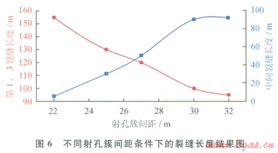 根據(jù)改造儲層的物性參數(shù)以及相鄰水平井的壓裂施工參數(shù),對要優(yōu)化的水平井進行了“分段多簇”壓裂裂縫擴展模擬,不同射孔簇間距條件下得到的壓裂裂縫長度如圖6所示(考慮對稱性,兩端射孔簇的裂縫在圖中只畫一條曲線):當射孔間距為22.0m時,中間射孔簇的壓裂裂縫基本沒有壓開,只形成了很短的壓裂裂縫。當射孔簇間距為30.0m時,中間的射孔簇形成的壓裂裂縫和兩端射孔簇形成的壓裂裂縫基本相當。因此,壓裂設(shè)計過程中,射孔簇的間距設(shè)定在30.0m左右比較合適,根據(jù)射孔簇間距參數(shù),每個壓裂段的長度確定為90.0m,壓裂段數(shù)為ll段。