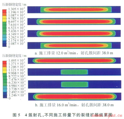 圖5所示的是4簇射孔、射孔簇間距為38.0m,施工排量分別為l2.0m3/rain和l6.0m3/min時的裂縫擴展情況,施工排量增大4.0m3/min,中間裂縫的長度發(fā)生了明顯變化;施工排量為l6.0m3/min、4簇射孔條件下,中間射孔簇無法形成有效裂縫。