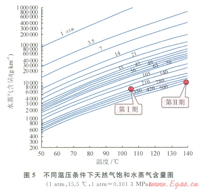 將2期充注成藏期的溫度、壓力投影至不同溫壓條件下天然氣飽和水蒸氣含量圖版上發(fā)現(xiàn)(圖5),在第Ⅰ充注期天然氣的攜水量介于5000~7000g/km3,在第Ⅱ充注期天然氣的攜水量介于l0000~12000g/km3,第Ⅱ期允注的天然氣攜水量是第Ⅰ期的近2倍,表明隨著溫度、壓力的增火火然氣攜水的能力鼴著增加,儲層中有更多的束縛水被蒸發(fā)氣化,不斷隨著天然氣的運(yùn)移攜帶出儲層,增大了地層水被攜帶到上覆地層的可能性[14],有利于超低含水飽和度氣藏的形成。
