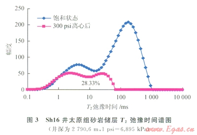核磁共振呵動流體實(shí)驗(yàn)原理是通過對儲層孔隙流體中氫核信號的觀測,可以贏接測量巖石中流體特性。并能獲得儲層有效孔隙度、自由流體和束縛流體體積、孔隙結(jié)構(gòu)等地質(zhì)信息[8-12]。巖心樣品飽和流體后置于均勻分布的靜磁場中,流體中的氫核(1H)會被磁場極化,產(chǎn)生磁化矢量,此時(shí)對樣品施加一定頻率的射頻場,就會產(chǎn)生核磁共振;撤掉射頻場就會接收到氫核在孔隙中做弛豫運(yùn)動幅度隨時(shí)間以指數(shù)函數(shù)衰減的信號。核磁共振信號衰減的快慢采用橫向弛豫時(shí)間T2來描述,飽和流體的巖樣進(jìn)行核磁共振T2測試時(shí),T2弛豫時(shí)間的大小取決于流體分子受孔隙固體表面作用力的強(qiáng)弱,因此利用核磁共振了T2譜可對巖樣孔隙內(nèi)流體的賦存狀態(tài)進(jìn)行分析,能夠定量測試出可動流體飽和度及束縛流體飽和度。圖3為Shl6井太原組砂巖儲層核磁共振實(shí)驗(yàn)的T2弛豫時(shí)間譜圖,可以確定,該砂巖儲層的束縛水飽和度為28.33%。