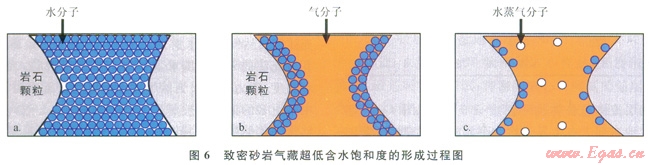 致密砂巖超低含水飽和度的形成過程如圖6所示,圖6-a為儲層早成巖期的機(jī)械壓實(shí)階段,此時(shí)干酪根未成熟,儲層孔喉中100%飽含地層水;圖6-b為儲層的可動水排出階段,此時(shí)隨著干酪根成熟度的增加,生成的天然氣注入儲集層,驅(qū)替儲層的可動水,儲層的含水飽和度接近于儲層的束縛水飽和度;圖6-c為束縛水蒸發(fā)氣化階段,此時(shí)隨著溫度壓力的增大和干氣的注入,使儲層的束縛水被蒸發(fā)氣化,不斷隨著天然氣的運(yùn)移攜帶出儲層,從而形成超低含水飽和度氣藏。