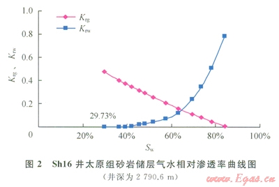 應(yīng)用氣水相滲和核磁共振2種實(shí)驗(yàn)技術(shù)方法測試束縛水飽和度。氣水相對滲透率曲線在水相滲透率為0處對應(yīng)的含水飽和度即為束縛水飽和度,圖2為Shl6井太原組砂巖儲層的氣水相對滲透率曲線,可以確定該砂巖儲層的束縛水飽和度為29.73%。
