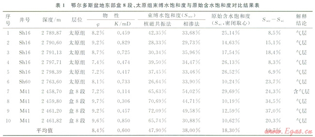 選取鄂爾多斯盆地東部的Shl6、Sh60井和M4l片盒8段、太原組的l0塊密閉取心樣品,開展氣水相滲、核磁共振實(shí)驗(yàn)測試,將密閉取心所測試的儲層原始含水飽和度與采用氣水相滲、核磁共振實(shí)驗(yàn)所確定的束縛水飽和度進(jìn)行了對比。