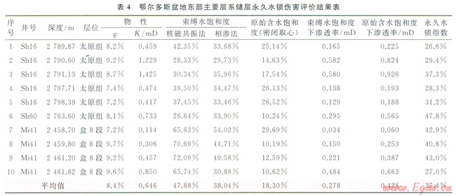 10塊巖心樣品的評價(jià)結(jié)果顯示(表4),永久性水鎖滲透率傷害率最小為26.6%,最大為47.8%,平均為35.4%;原始含水飽和度下氣相滲透率是束縛水飽和度下氣相滲透率的l.4~1.9倍,平均為1.6倍。因此設(shè)法預(yù)防和解除永久性水鎖傷害,恢復(fù)原始含水飽和度下的氣相滲透率,對提高相同儲層物性條件的儲層氣相滲透率和提高單井產(chǎn)量有著重要的意義。
