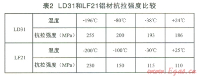 常見的氣化器材質一般為LF21(美國牌號為3003)和LD31(美國牌號為6063),鋁合金LD31材質從+24℃~-196℃強度相近,在常溫與低溫時,主體結構應力均衡、抗拉強度也是均衡的。而LF2l在常溫與低溫時,從+25℃~-200℃強度相差懸殊近l倍,抗拉強度相差較大,力學的差異也較大,具體抗拉強度參數見表2。在冷熱交替頻繁時容易造成金屬疲勞現象,而導致較易出現裂縫。但是LD31鋁材的抗氧化性能低于LF21鋁材,所以LD31鋁材需要進行抗氧化防護。氣化器材質宜選用LD31鋁型材。對于相同長度的換熱翅片管,顯然翅片管管徑大的氣化量大。