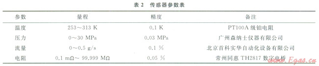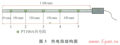 子系統(tǒng)包括溫度、壓力、流量、電阻率、聲速5項(xiàng)參數(shù)的采集與處理,各傳感器參數(shù)見(jiàn)表2。其中,溫度傳感器采用集成鎧裝形式,5個(gè)PTl00A級(jí)鉑電阻裝入l根316L的Æ6mm鋼管中,結(jié)構(gòu)如圖3所示。