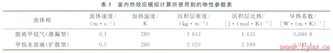 為了驗(yàn)證實(shí)驗(yàn)條件下通過(guò)U型加熱盤(pán)管是否能獲得類似自然條件下的地溫梯度,針對(duì)滲漏、擴(kuò)散兩種成藏方式,利用Fluent軟件對(duì)釜內(nèi)的溫度分布進(jìn)行了模擬計(jì)算,計(jì)算所用到的物性參數(shù)列于表3。流體紅275K下進(jìn)入反應(yīng)釜,經(jīng)過(guò)U型加熱盤(pán)管換熱后,流經(jīng)石英砂構(gòu)成的孔隙率為0.38的沉積層,由頂部的出口流出反應(yīng)釜。平衡后的溫度分布如圖6所示。