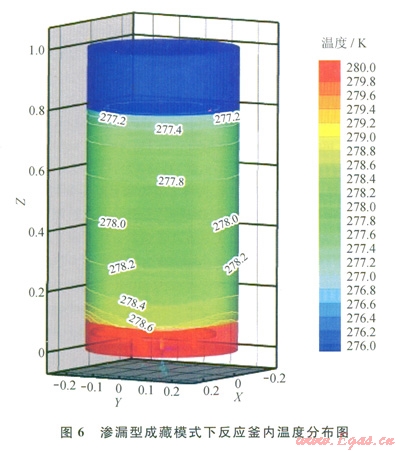 滲漏型成藏模式中,游離甲烷氣以0.1g/s的流速自底部進(jìn)氣口進(jìn)入反應(yīng)釜內(nèi),并迅速擴(kuò)散至整個(gè)底部氣囊(0~100mm高度區(qū)間)。經(jīng)過(guò)氣囊緩沖,氣體的流速顯著降低。由于氣體熱容較低,當(dāng)氣體離開(kāi)底部氣囊滲流進(jìn)入沉積層時(shí),溫度已被U型管加熱至280K。因此,在沉積層底部靠近氣囊的區(qū)域,傳熱方式為甲烷氣與沉積層顆粒之間對(duì)流傳熱和底部氣囊與沉積層整體之間的導(dǎo)熱。隨著甲烷氣在滲流過(guò)程中溫度迅速降低,對(duì)流傳熱作用減小,導(dǎo)熱逐漸成為主要傳熱方式。因此,在圖6中沉積層區(qū)域底部的等溫線受滲流影響有明顯的起伏,而隨著位置的升高,起伏現(xiàn)象逐漸消失,等溫線與底面平行。沉積層整體高度為700mm,底面的溫度為278.8K,頂層溫度為276K,整體溫差2.8K,溫度梯度折合為4K/m,與表1中凍土帶水合物藏地溫梯度符合l:l00的比例,略小于海底水合物藏溫度梯度,但也可通過(guò)改變給熱溫度加以修正。
