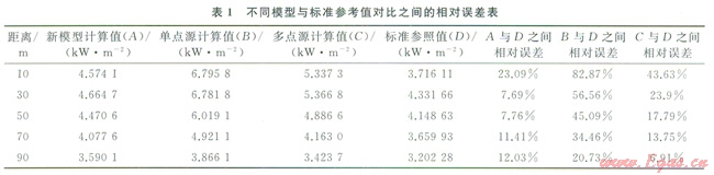 從圖5可以看出,4個計算結(jié)果值呈現(xiàn)出一樣的變化規(guī)律,在下風(fēng)向距離,隨著與火炬距離的增加,熱輻射強度呈現(xiàn)先增加后減少的趨勢。在不同距離取四者數(shù)值進行對比,如表l所示,新模型計算結(jié)果與標準參考值之間的相對誤差除了在10m處為23.09%,其余在30m、50m、70m、90m處均低于l5%;常規(guī)單點源模型計算結(jié)果與標準參考值之間的相對誤差在不同距離處的波動較大,在10m處,相對誤差較火(大于80%),隨著距離的變大,相對誤差有減小的趨勢,但在各點始終均大于新模型與標準參考值之間的相對誤差;而與新模型取相同點源數(shù)的常規(guī)多點源計算結(jié)果與標準參考值之間的相對誤差相比較于單點源計算值減小了許多,但在70m范圍內(nèi)相對誤差仍遠大于新模型計算值,在70m范圍之外,常規(guī)多點源與標準參考值之間的相對誤差才達到可接受的l5%之內(nèi)??傮w來說,相比于與常規(guī)單點源和常規(guī)多點源計算結(jié)果,以數(shù)值模擬的結(jié)果為標準參照,新模型計算出的熱輻射強度有著更高的精度,同時計算復(fù)雜程度沒有提高很多,滿足工程使用的要求,可以在確定高架火炬安全距離得到很好的應(yīng)用與推廣。
